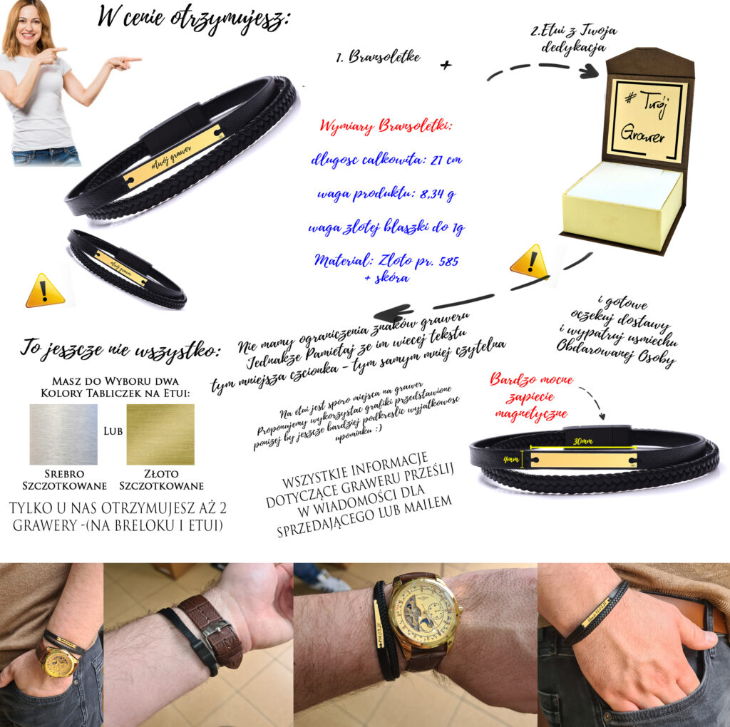 Bransoletka Męska Złota próba 585 + Grawer + Etui + Skóra