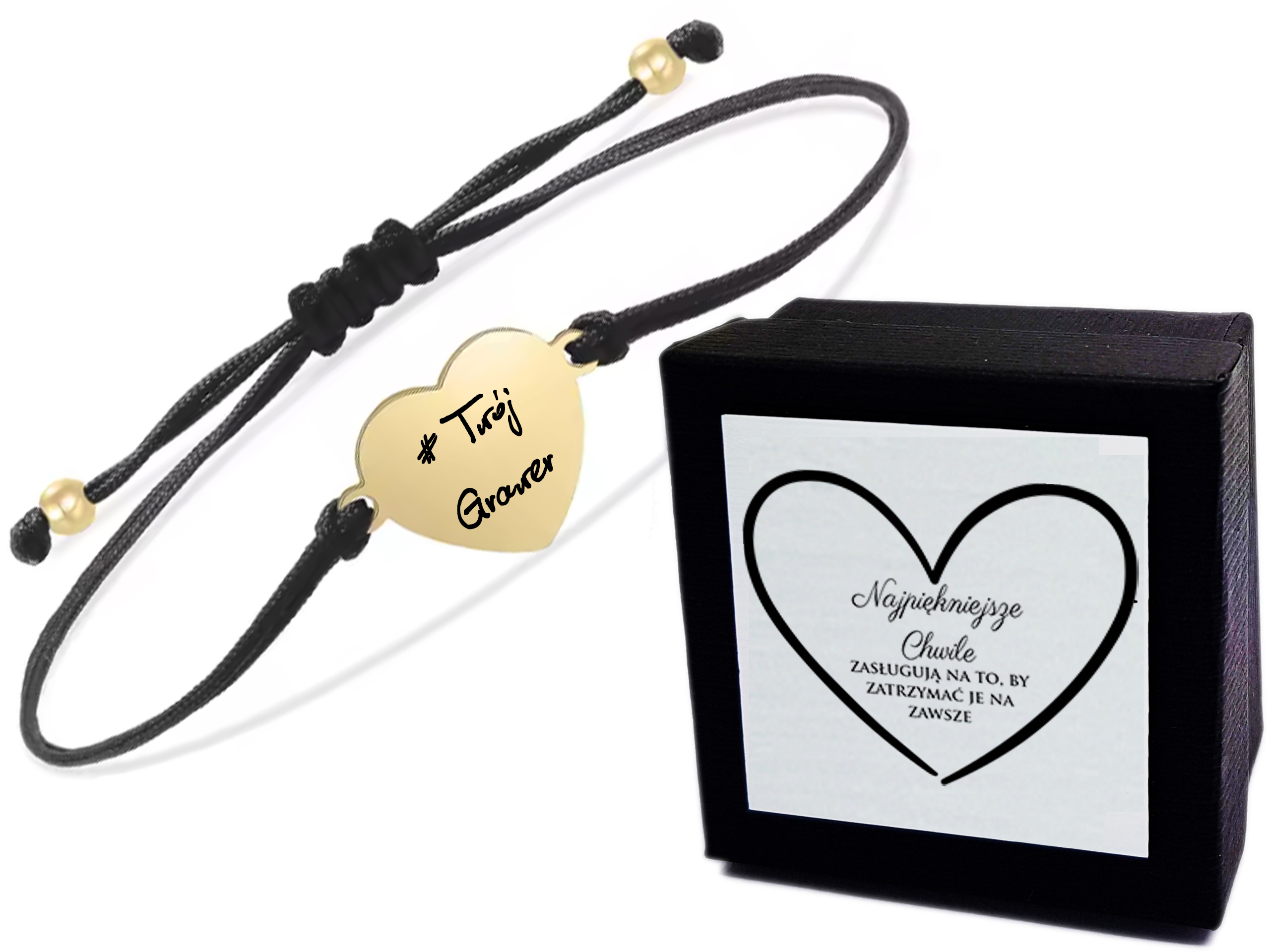 Bransoletka Złota Serce z Grawerem na Czarnym Sznurku – Prezent dla Niej + Etui + Grawer – Stal
