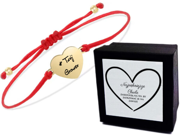 Bransoletka Złota Serce z Grawerem na czerwonym Sznurku – Prezent dla Niej + Etui + Grawer – Stal