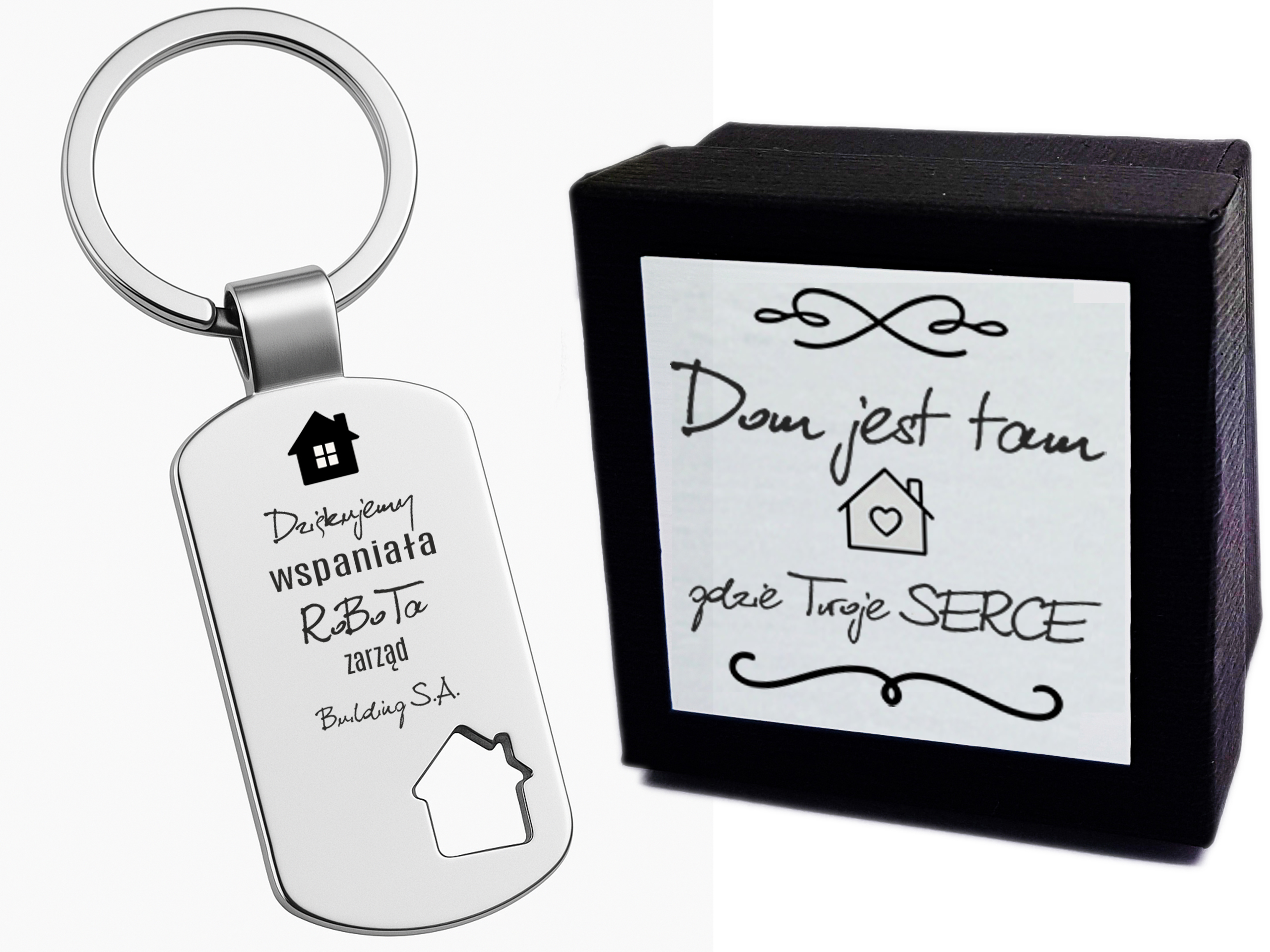 Metalowy, błyszczący, przestrzenny brelok 3D w kształcie Prostokąta z Motywem Domu a wszystko zapakowane w eleganckie pudełko także z grawerem. Idealne na prezent dla bliskich!