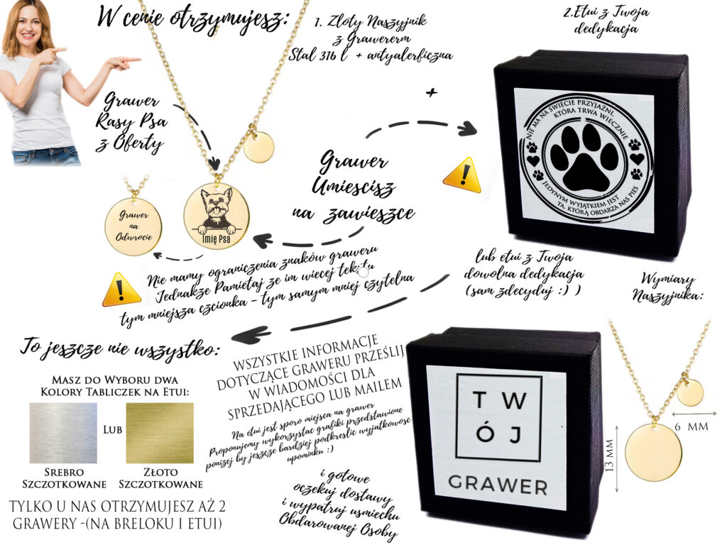 🐾 Złoty naszyjnik z grawerem rasy psa + imię pupila + etui
