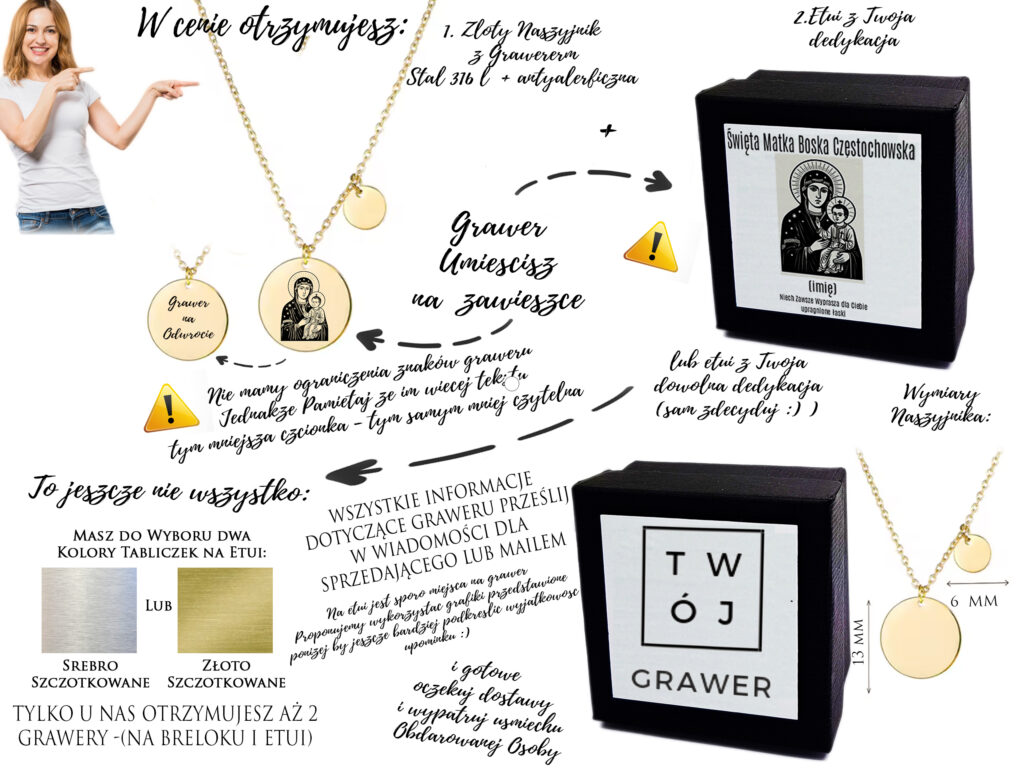 Jej obecność na Jasnej Górze to nie tylko historia i tradycja, ale żywa, codzienna obecność Maryi, która dalej działa cuda i przemienia serca.Złoty naszyjnik z Matką Boską Częstochowską + etui z jej wizerunkiem i możliwością personalizacji