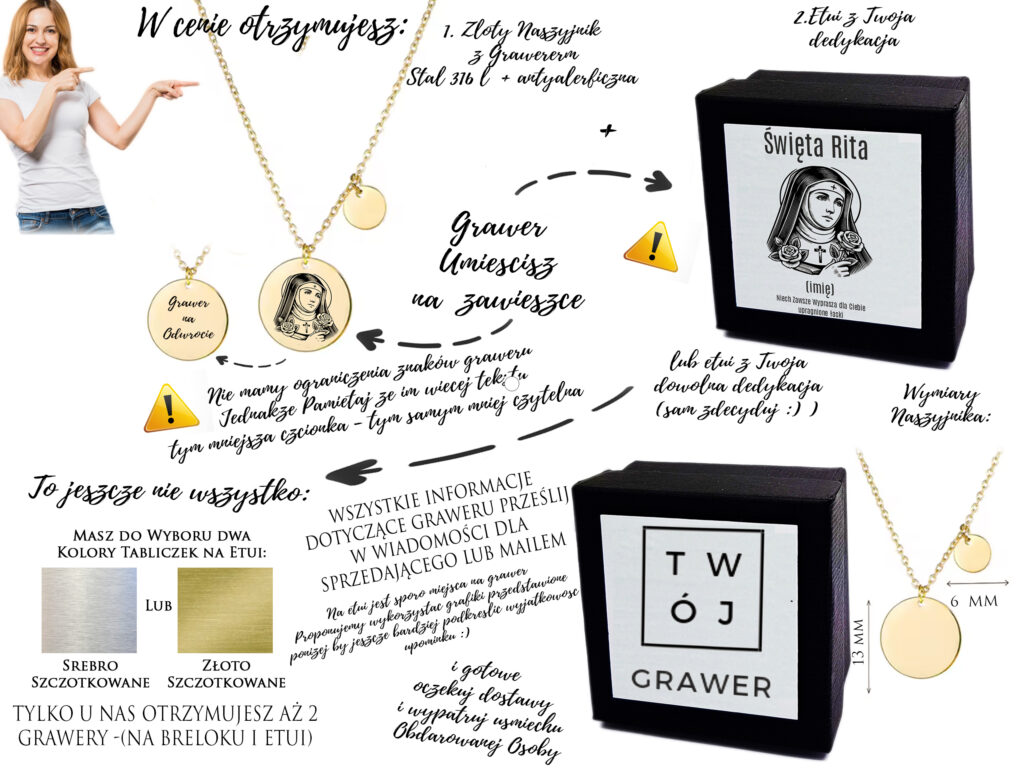 Dziś pozostaje patronką nadziei, szczególnie dla tych, którzy są w sytuacjach pozornie bez wyjścia.Naszyjnik złoty z wizerunkiem Świętej Rity + etui z jej wizerunkiem i personalizacją