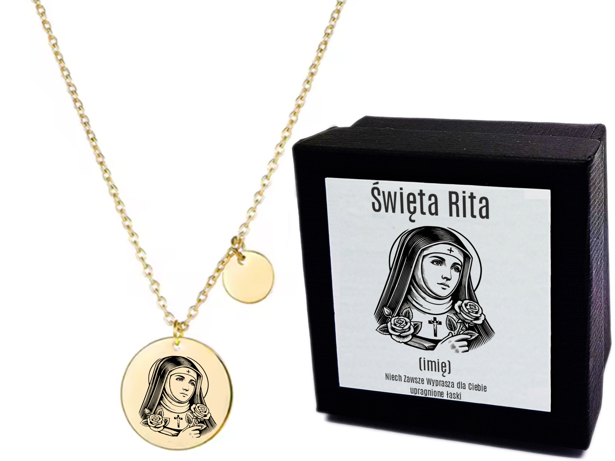 Naszyjnik Złoty Damski Medalik – Św. Rita – Celebrytka z Grawerem – Kółka – Delikatny – Prezent dla Niej + Etui + Grawer