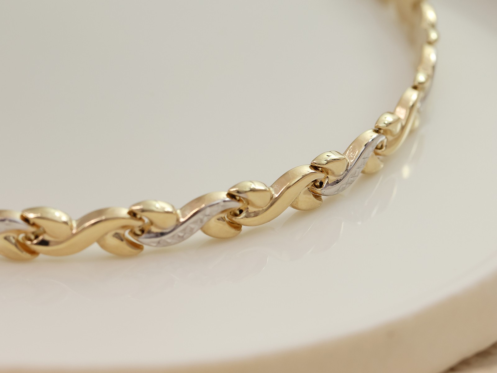 Złota bransoletka 585 z białym złotem – zmysłowy splot, który hipnotyzuje blaskiem