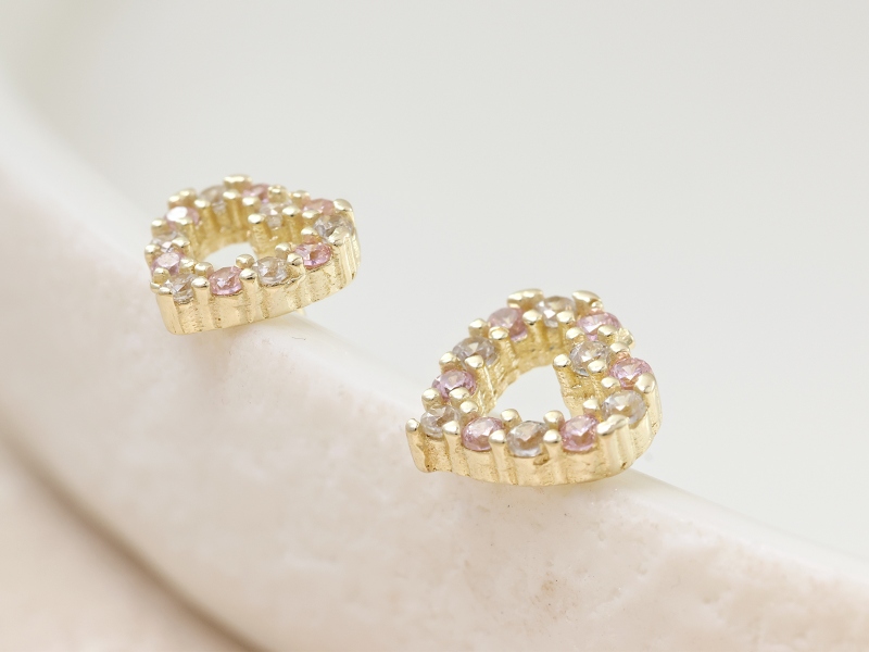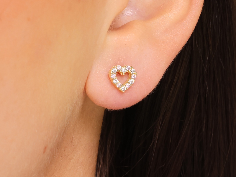 Złote kolczyki wkrętki próba 585 (14Kt) w kształcie serca, zdobione błyszczącymi cyrkoniami. Stylowe, kobiece i wygodne – idealne na każdą okazję.