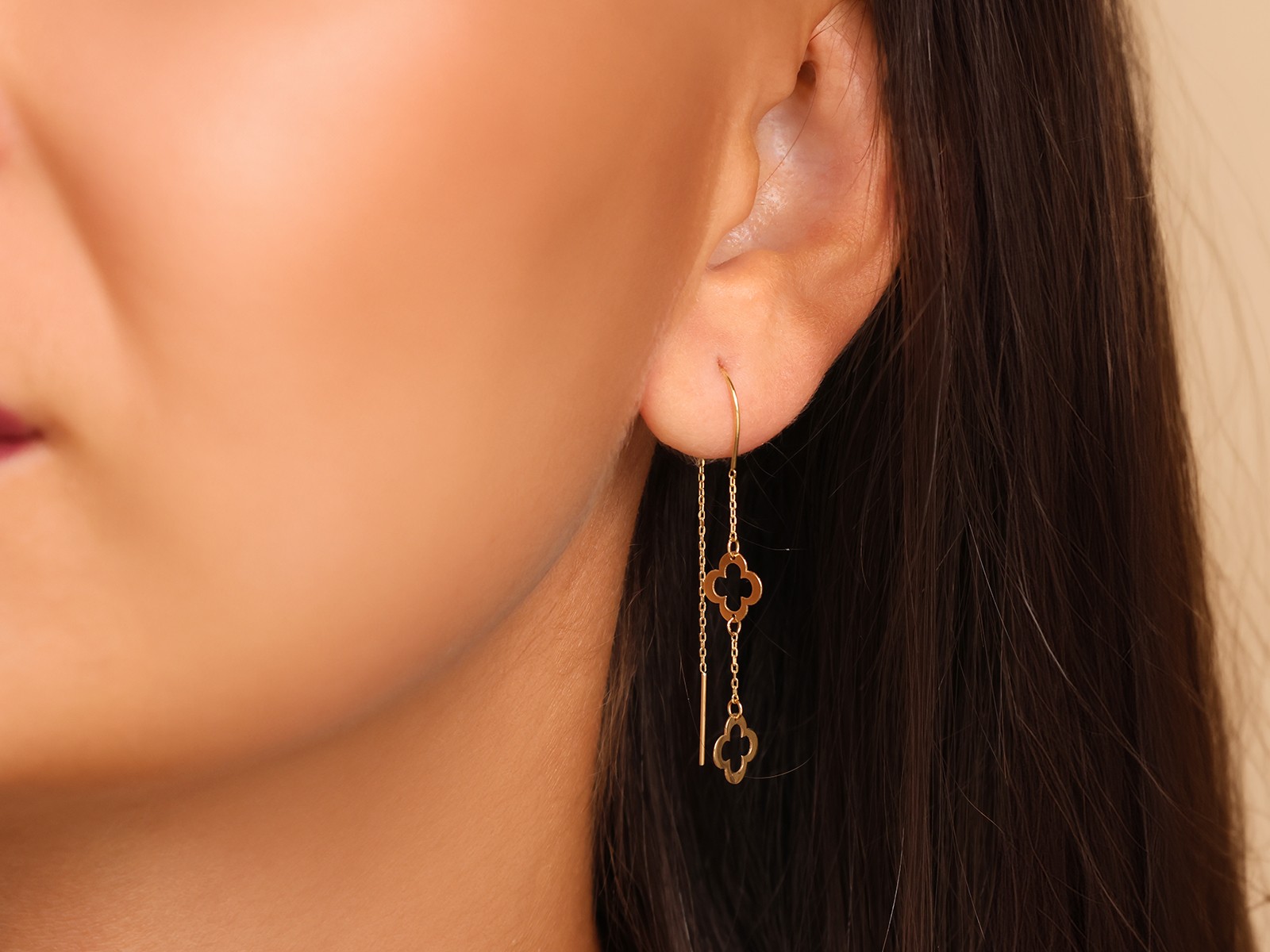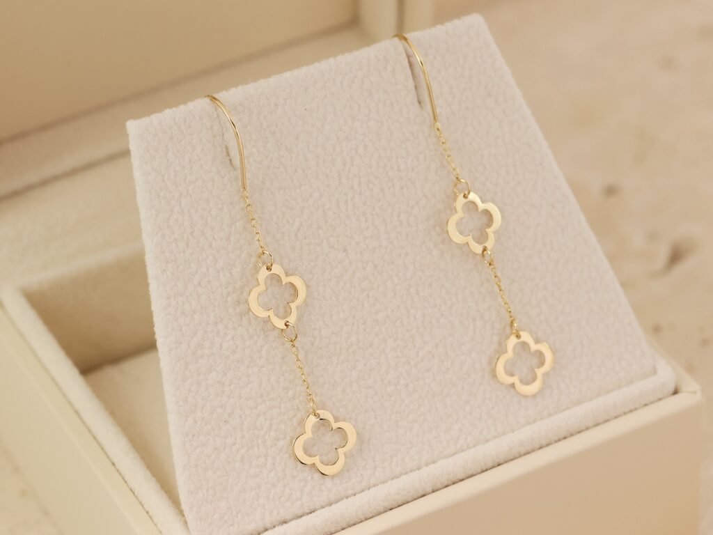 Delikatne, pełne wdzięku i symboliki – złote kolczyki przeciągane z podwójną koniczynką to biżuteria, która łączy lekkość, styl i odrobinę szczęścia.