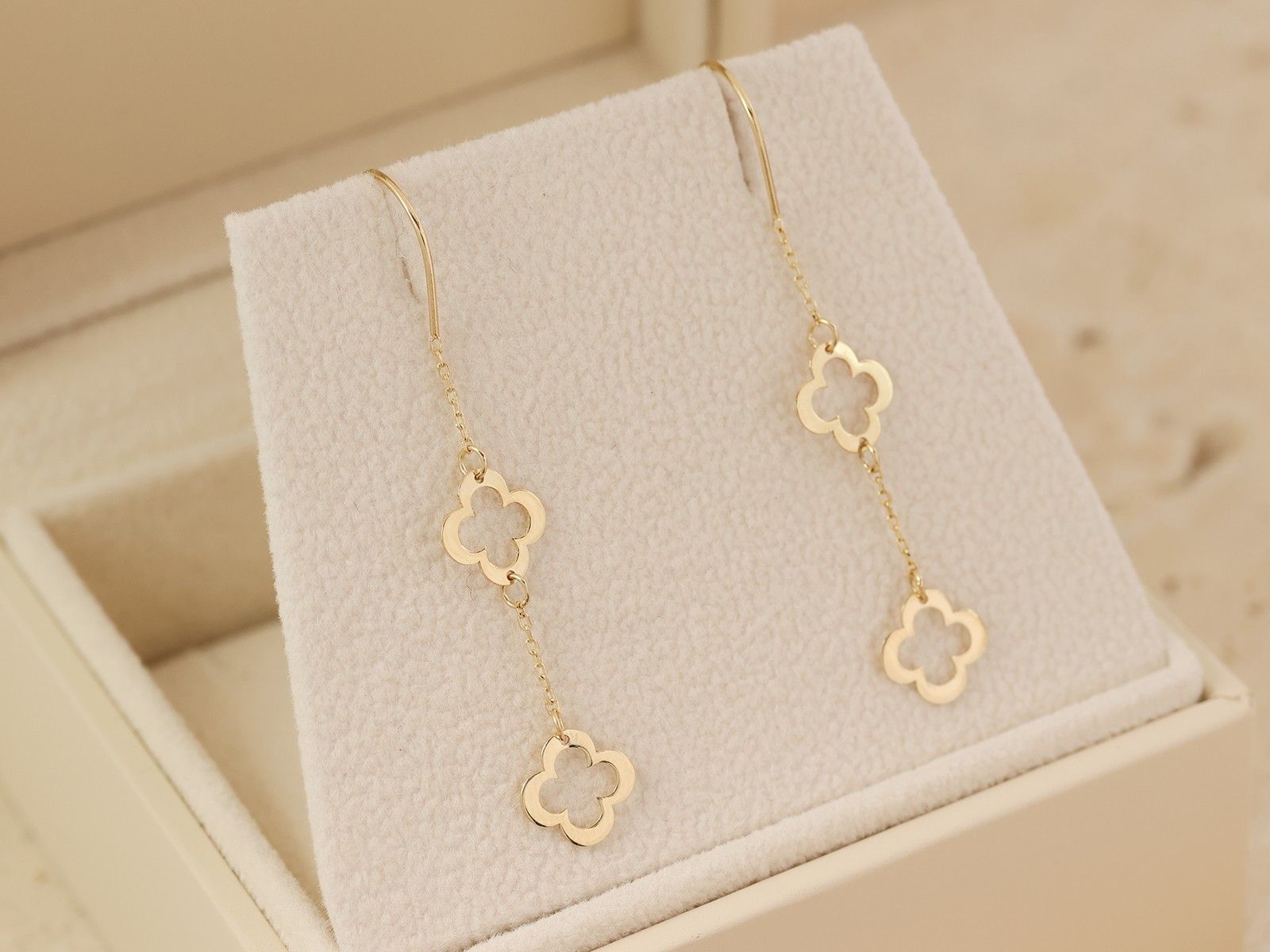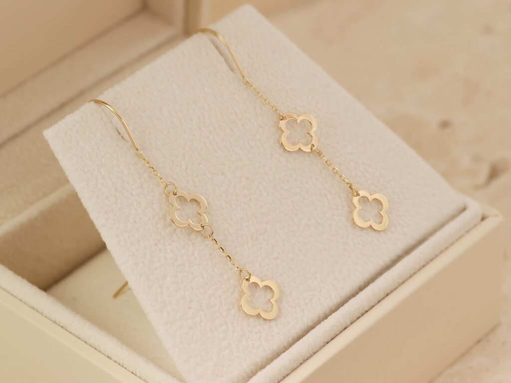 Zamów swoje złote kolczyki przeciągane z podwójną koniczynką i noś przy sobie symbol radości, miłości i powodzenia każdego dnia 🍀✨